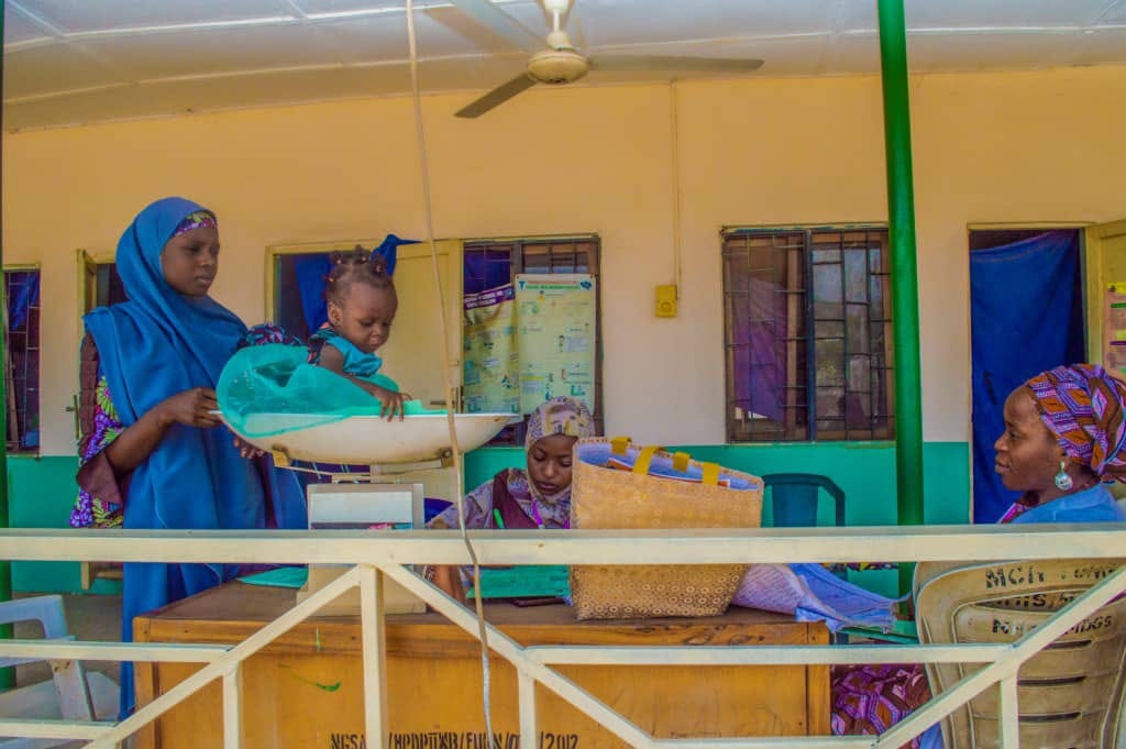 Nigeria: A mother weighing her baby at Tunga PHC in Nigeria
