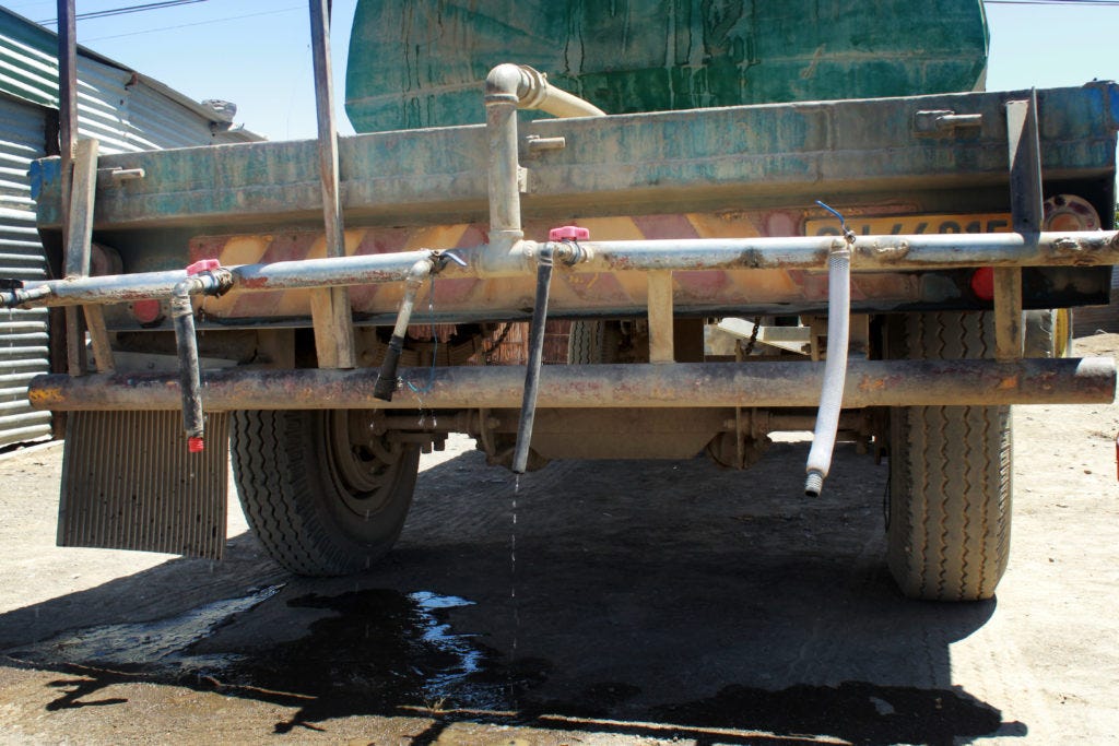 A tanker carrying purified water. Residents say that water is delivered irregularly and there is not enough for everyone in the settlement. Photo: Brandon van Wyk
