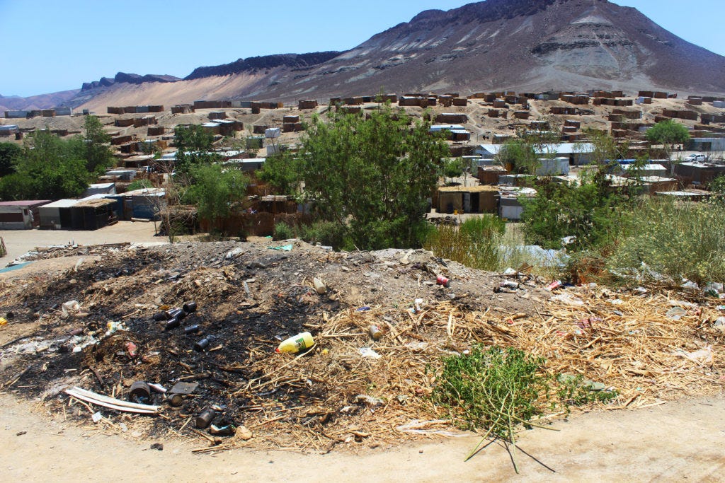 But the oasis-like beauty of the area’s grape farms hide a dark secret: the 16,000 farmworkers who care for the vines and harvest the grapes earn a pittance and live under harsh conditions. Two kilometres from the grape farms, they live in an unnamed settlement in rudimentary reed and zinc structures, and have endured decades without potable water and other basic services like electricity and sanitation facilities. Residents even use the river and mountains as toilets.