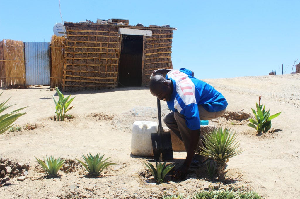 Levi Shimbilingwa has planted a number of aloe vera trees in front of his home. Despite the challenges he faces, Shimbilingwa says that he finds joy in nurturing his plants. Photo: Brandon van Wyk