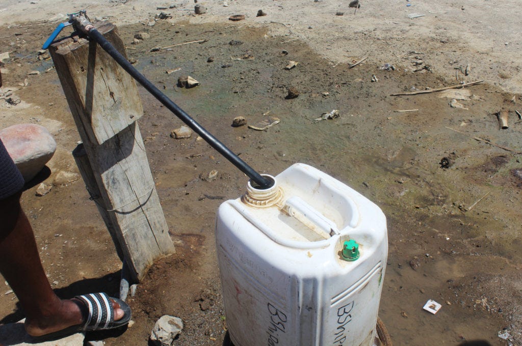 “I have been working here for such a long time, and I have been living in these reed houses that look like they are falling apart,” she said. “There is no decent shelter here. I am retiring next year because of the water problem.