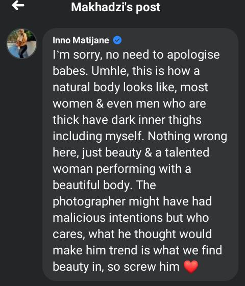 In reaction to the post, many of her Facebook Page followers say there is no need for her to apologise for having dark inner thighs as shown in the half naked picture saying this is in most women and that she is not the only one having such dark inner thighs.