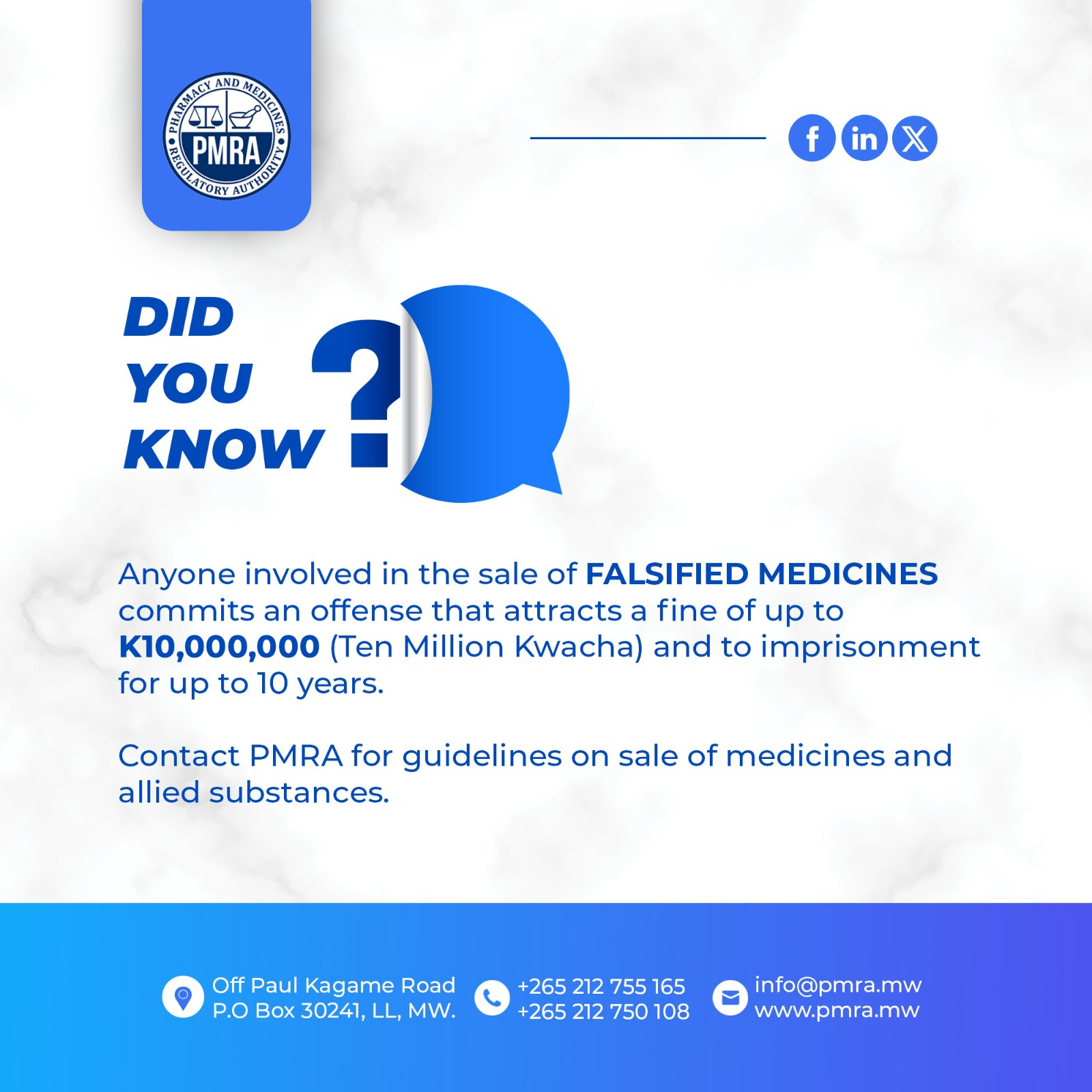 PMRA advised the public to report any suspicious activities related to the sale of medicines at info@pmra.mw.