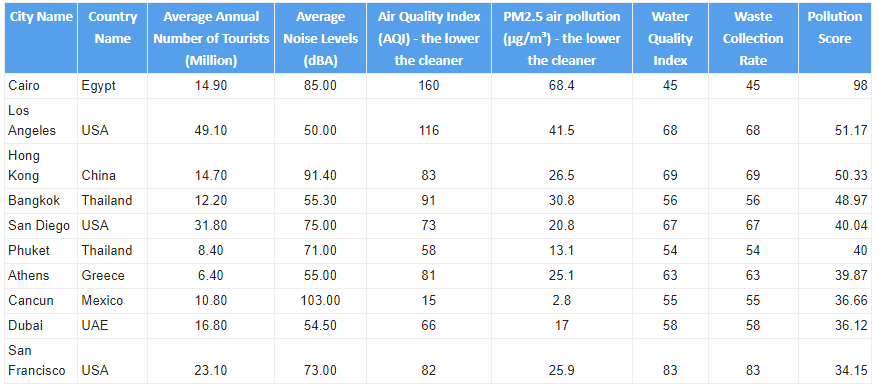 Cairo topped the list with the highest pollution score of 98, despite attracting 14.9 million visitors annually.