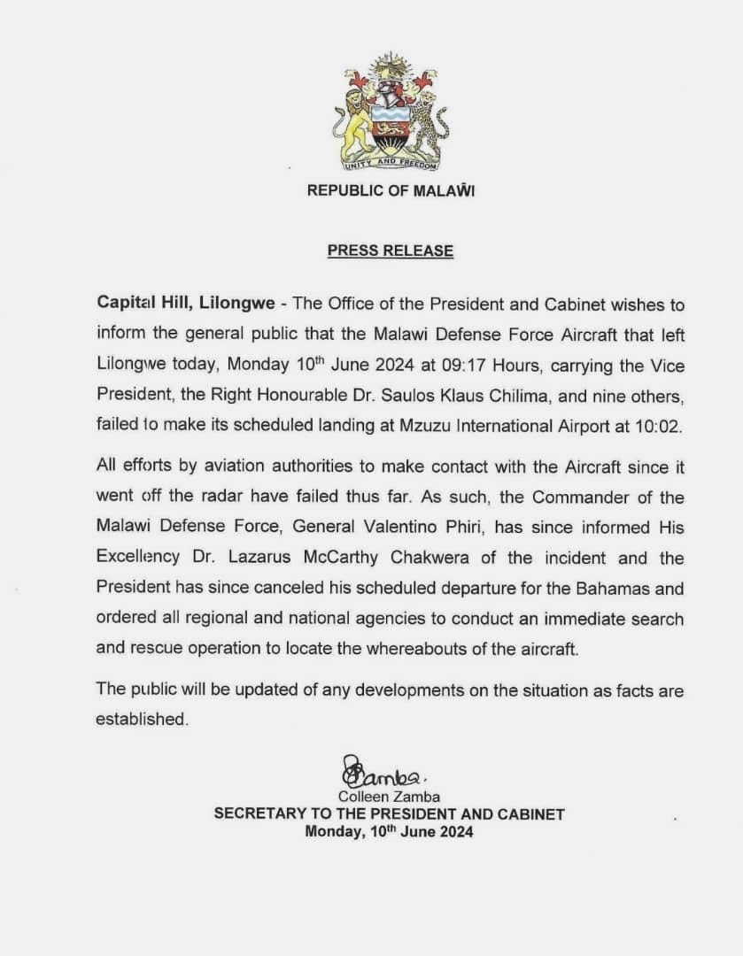 Colleen Zamba confirmed the aircraft with Chilima and eight others aboard departed Lilongwe at 9:17 a.m. bound for Mzuzu but never landed at the scheduled 10:02 a.m. arrival time, she said in a statement.